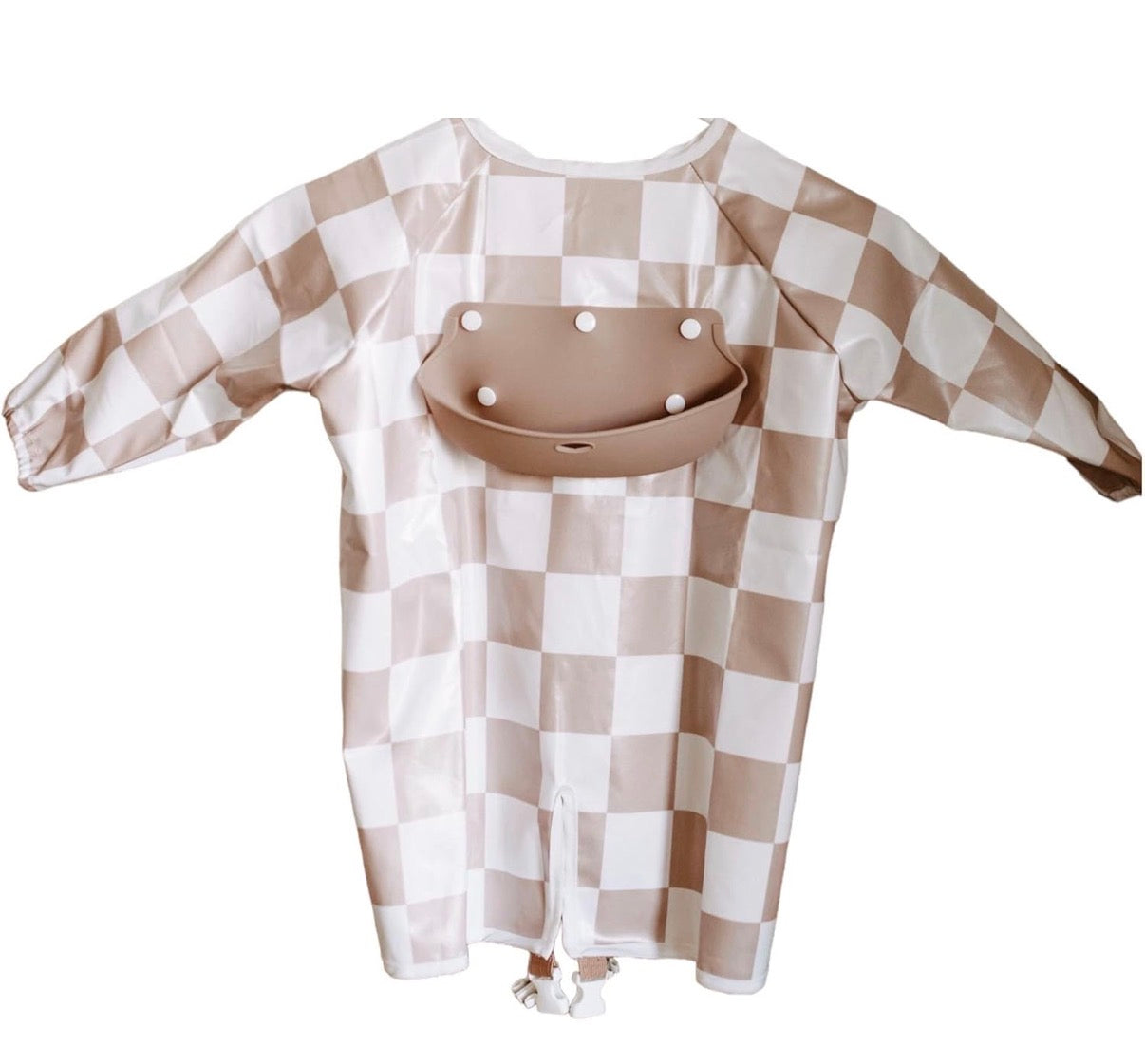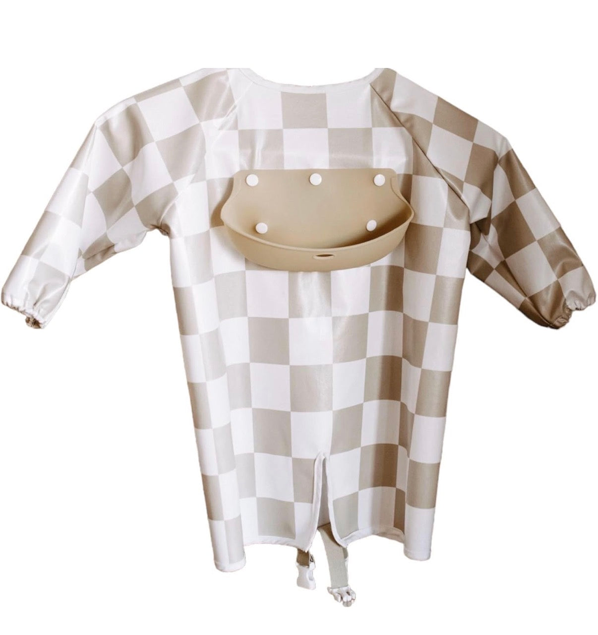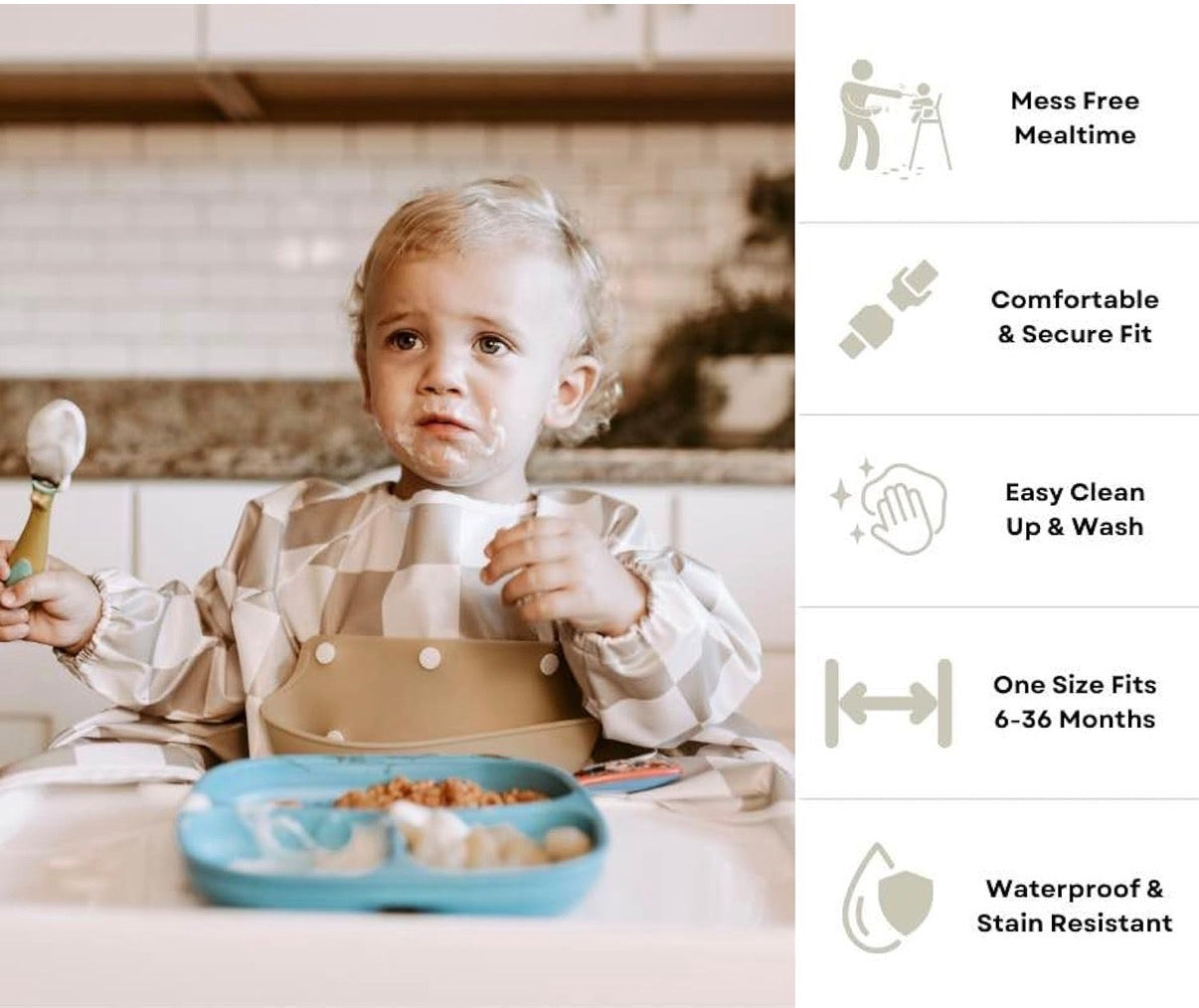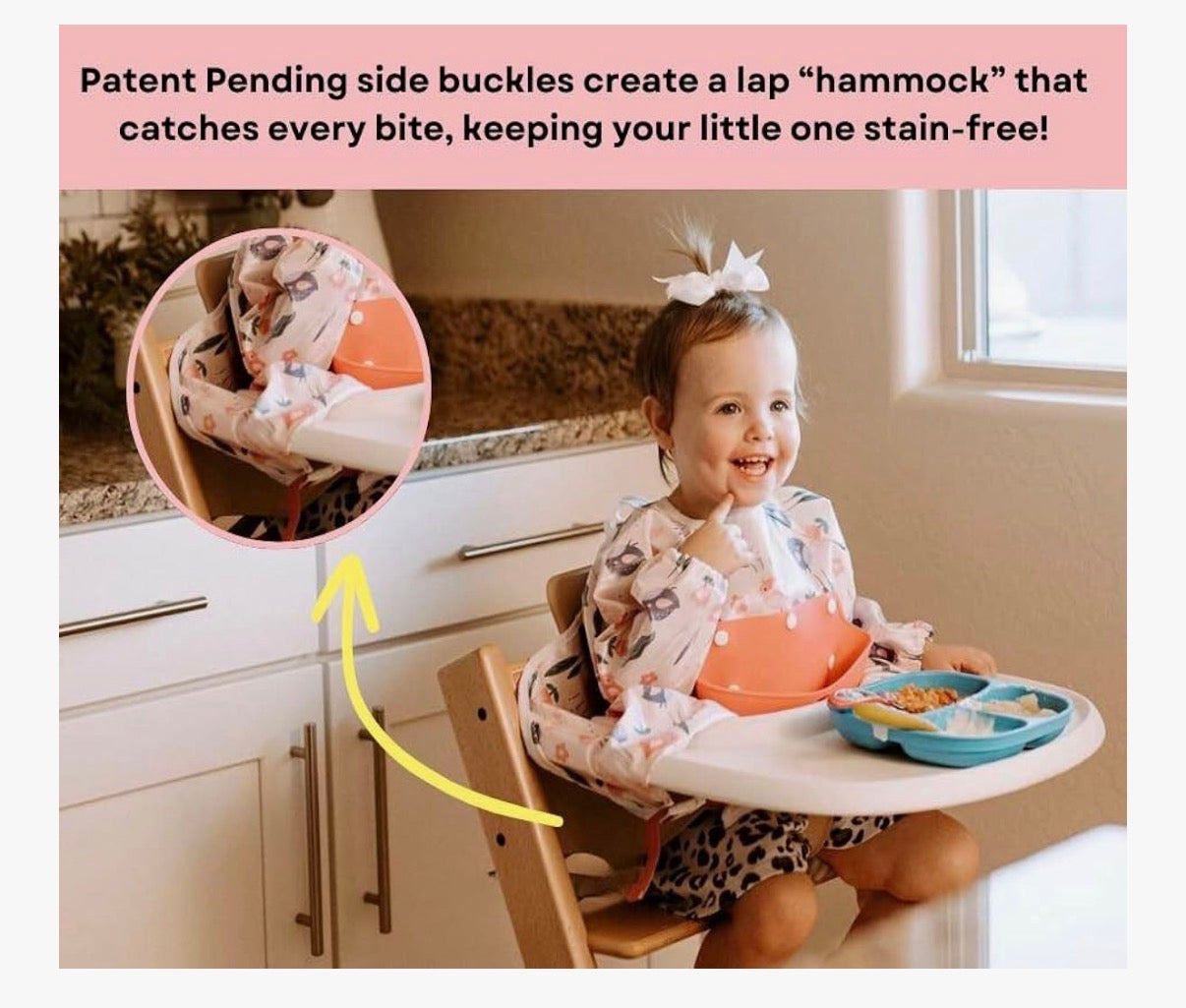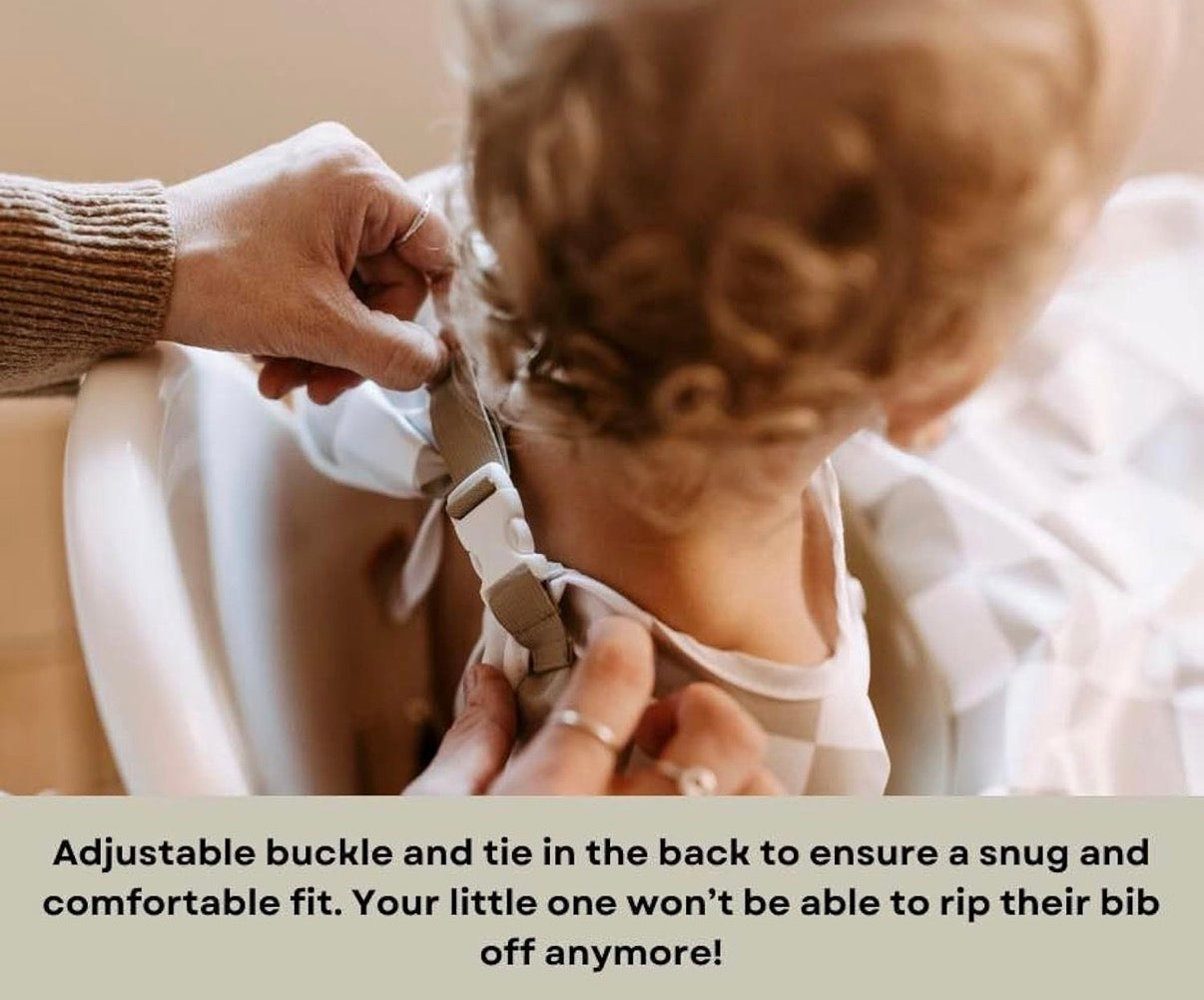 - Easily Adjustable—Bibvy is designed to grow with your little one and fits children 6 months to 3 years old. It features a convenient tie and adjustable buckle at the back: the tie is perfect for smaller children, while the buckle becomes handy as they grow. No more ripped-off bibs flying across the floor! Plus, elastic wrists provide further adjustment and additional comfort.